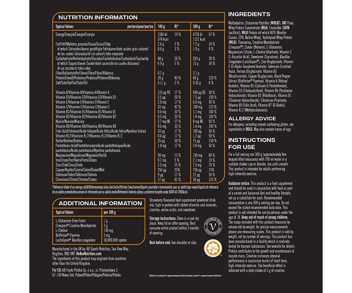 Maltodextrine, Peptides de Glutamine (BLÉ), Farine d’AVOINE, Concentré de Protéine de Whey (LAIT, Émulsifiant (Lécithine de SOJA)), Protéine de LAIT (dont 80% Caséine Micellaire, 20% Whey Native), Protéine de Whey Hydrolysée (LAIT), Arômes, Créatine Monohydrate (Creapure®), Colorant (Bétanine), Citrate de Magnésium, L-Glutamine, Bitartrate de L-Choline, Vitamine C (Acide L-Ascorbique), Édulcorant (Sucralose), Bacillus Coagulans (LactoSpore®), Bisglycinate de Zinc, Vitamine E ( Acétate de D-Alpha Tocophérol), Levure Enrichie en Sélénium, Bisglycinate Ferreux, Vitamine B3 (Nicotinamide), Bisglycinate de Cuivre, Extrait de Poivre Noir (BioPerine® Pipérine), Vitamine A (Acétate de Rétinyle), Vitamine B5 (D-Pantothénate de Calcium), Vitamine D3 (cholécalciférol), vitamine B6 (chlorhydrate de pyridoxine), vitamine B2 (riboflavine), vitamine B1 (chlorhydrate de thiamine), picolinate de chrome, vitamine B9 (acide folique), vitamine B7 (D-biotine), vitamine B12 (méthylcobalamine).